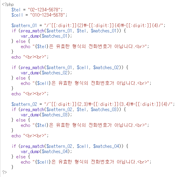 2. /^[[:digit:]]{2,3}-[[:digit:]]{3,4}-[[:digit:]]{4}/ // 02-1234-5678, 031-123-5678, 010-1234-5678, ...