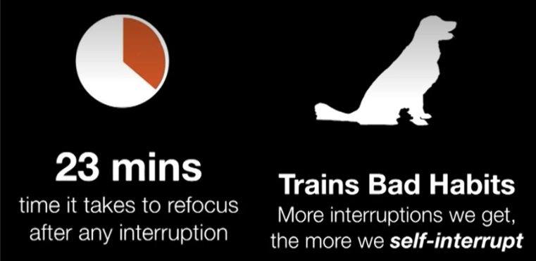 강연에서는 흐트러진 집중력을 다시 회복하려면 평균 23분이 걸린다고 언급한다. 그리고 이러한 현상이 계속되면 나쁜 습관을 형성하기도 한다고 한다. 외부 방해가 지속적으로 계속 되면 결국 나중엔 자기 자신을 방해하는 습관이 형성되는 것이다. 그래서 우리는 사실 3.5분마다 자신을 방해한다고 한다.