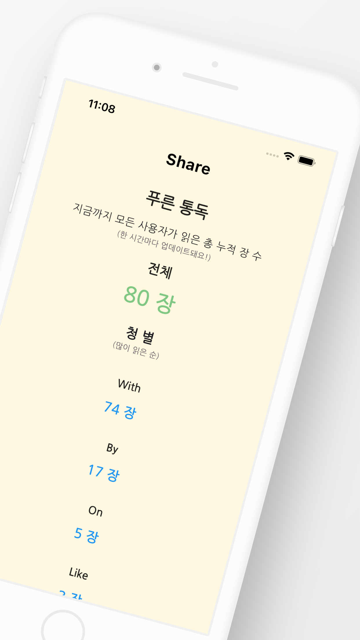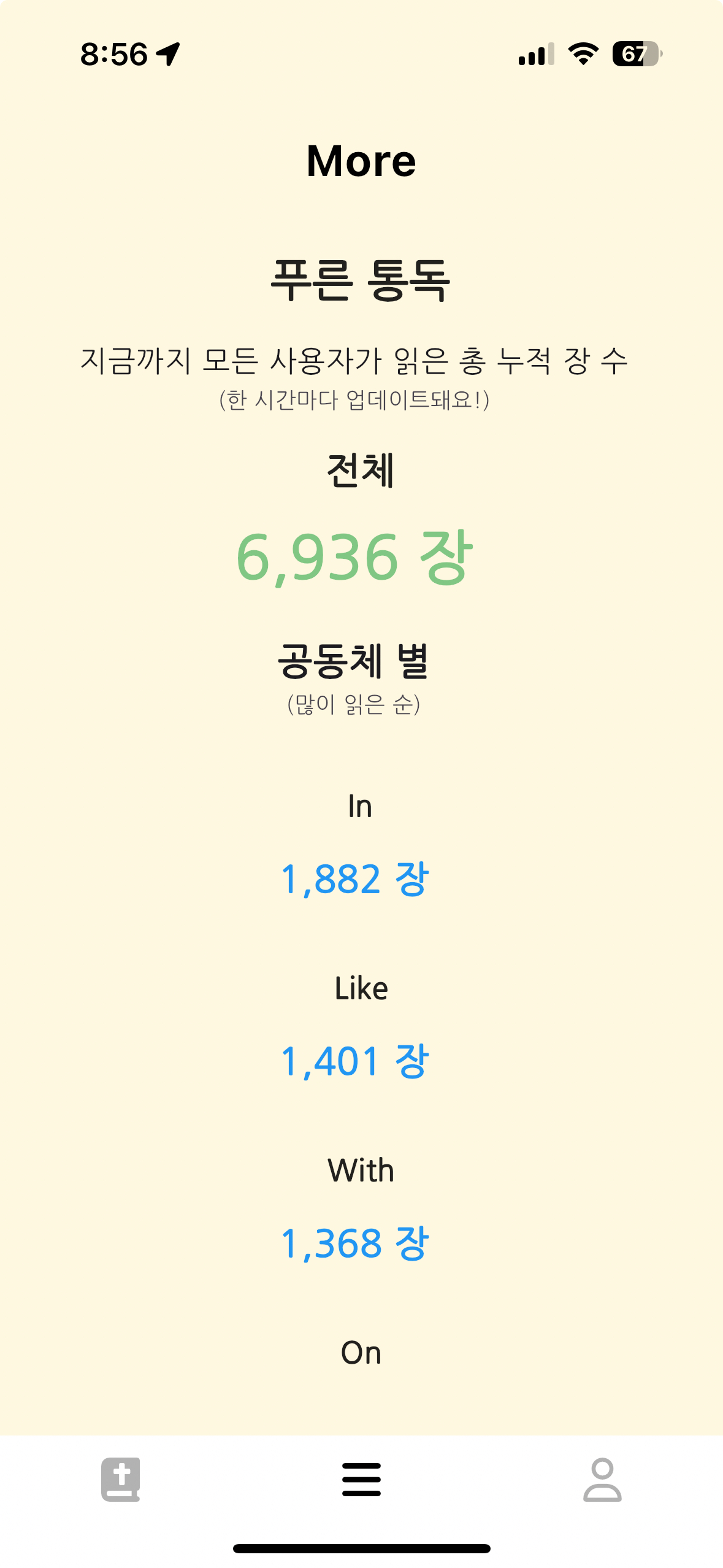 현재 앱에서는 전체 사용자의 총 읽은 누적 장 수만을 보여 주지만 서버 데이터베이스에 주차별로 모두 읽은 사람들의 목록 또한 주기적으로 정리하고 있었고 프로그램이 종료될 때쯤 데이터를 가공하여 시상을 위한 집계 데이터를 제공하기로 했어요.
