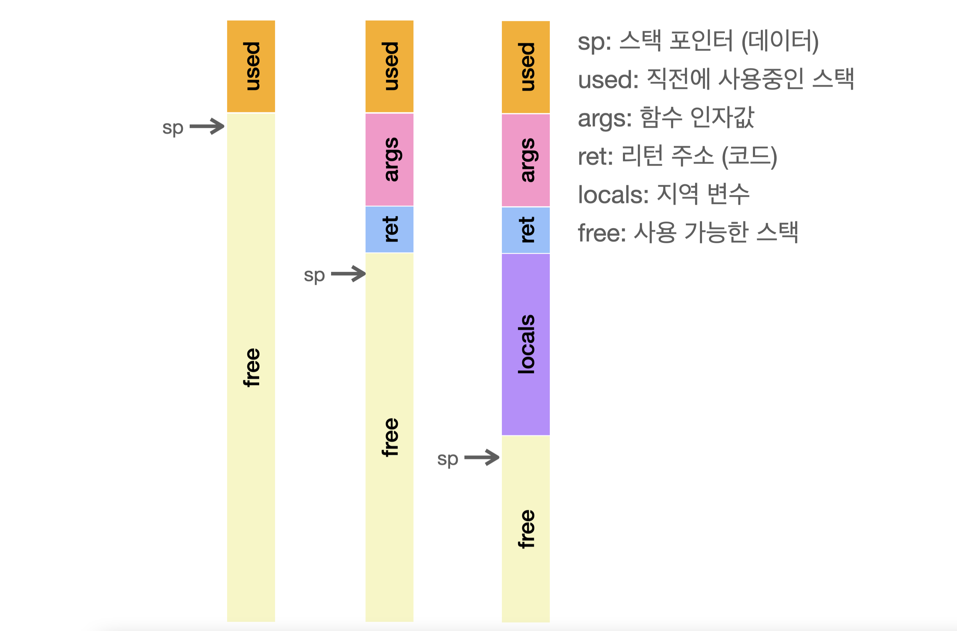 - 역할: 함수 호출 스택을 관리하며, 지역 변수, 매개변수, 반환 주소 등을 포함합니다.