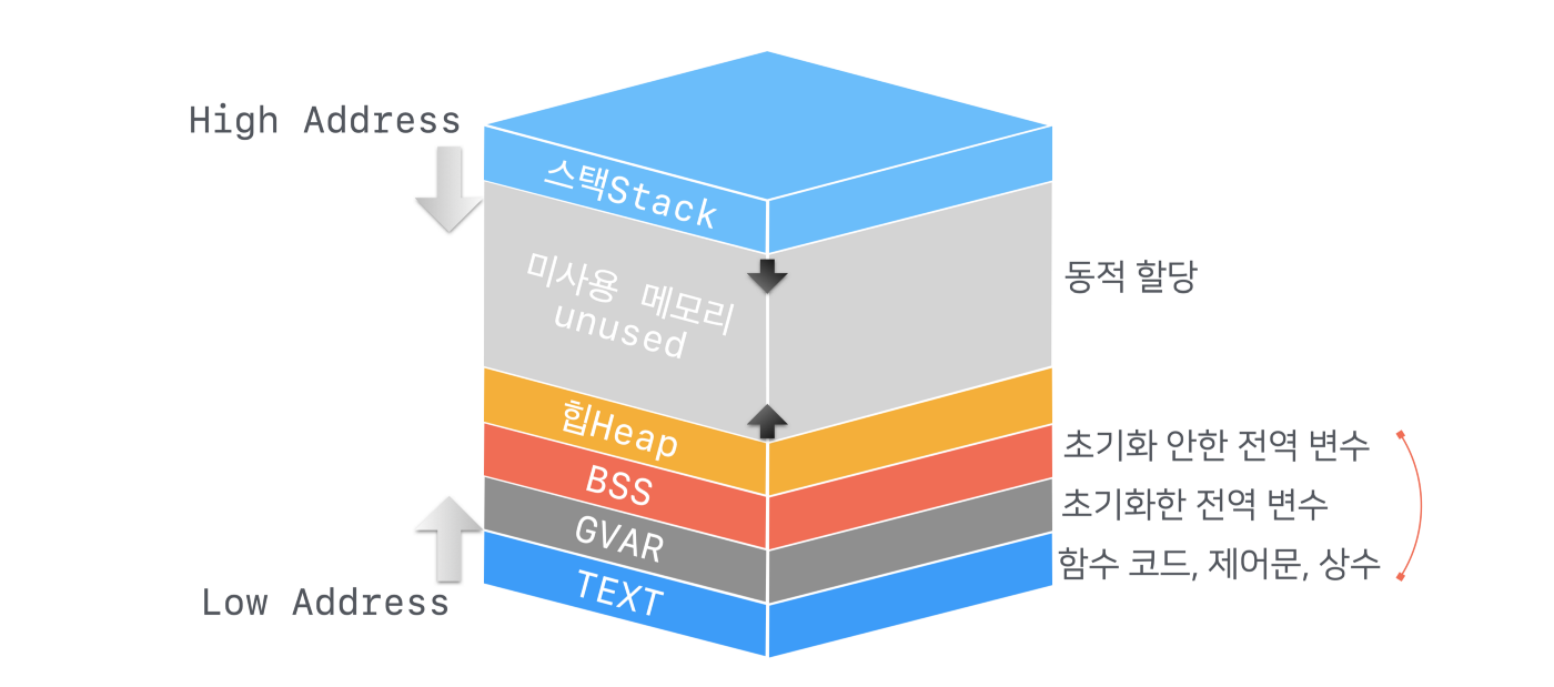프로세스의 메모리 구조는 각기 다른 목적을 가진 여러 주요 섹션으로 나뉩니다: