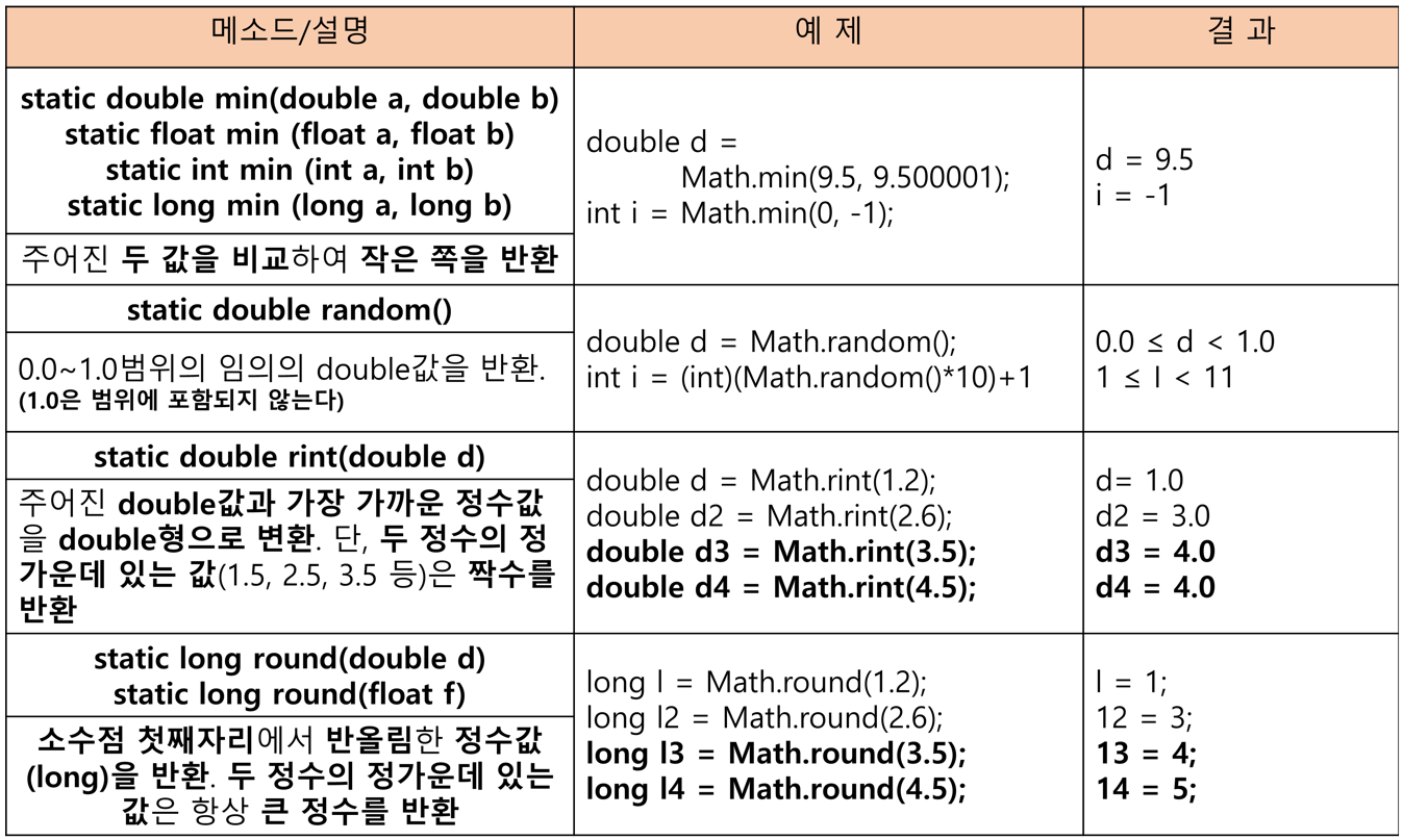 | protected void finalize() | 객체가 소멸될 때 가비지 컬렉터에 의해 자동적으로 호출. 이때 수행되어야하는 코드가 있을 때 오버라이딩. (거의 사용X) |