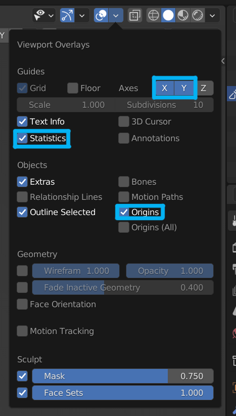 x,y 표시해준거 키기 / statistice 세부 내용 키기 / Origins 중앙점 보이는거 키기 (오브젝트 모드에서만 보임)
