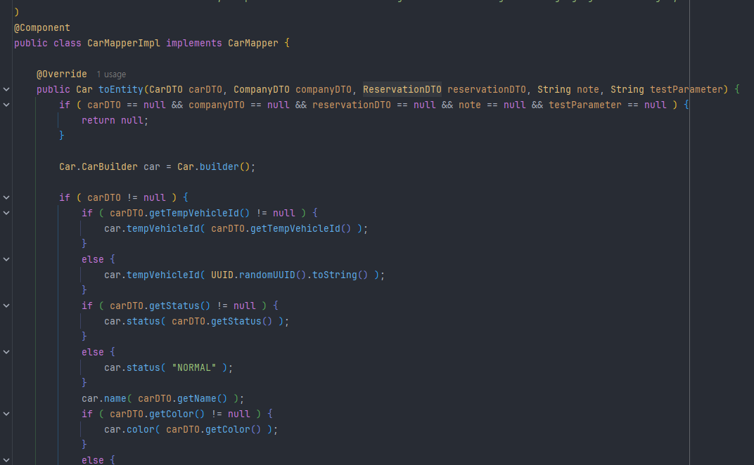 default Car toEntity(CarDTO carDTO, CompanyDTO companyDTO, ReservationDTO reservationDTO, String note, String testParameter){