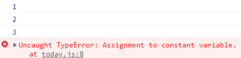 결과값 : 상수는 변하지않는 값이라고한다. 그말은, 새롭게 값을 수정하면은 에러가 뜰수밖에없다.