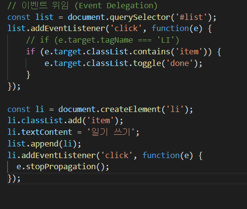 옆에 코드를 보면은 부모 요소인 ul태그를 선택해서 하나씩 클릭을 하면은 작동이 완료된다. 또한, 버블링을 막을려면, e.stopPropagation( )를 사용하면 된다. 그리하여, 추가한 요소는 토글효과를 보지 못한다.