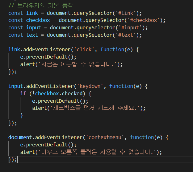 브라우저의 기본 동작을 막기위해서는 e.preventDefault()을 이용하면 된다.