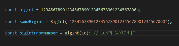 정수 끝에 n을 붙이거나 정수 앞에 BigInt를 호출하면 된다.