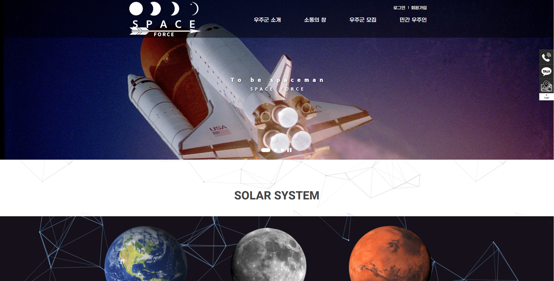 이 사이트는 대한민국의 우주군 창설을 가정하고 우주군의 사이트를 만들어 보았으며 레이아웃은 Tourlist in Tour를 참고하여 제작하였다.ㅣ