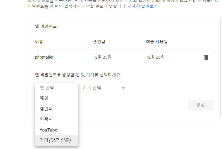 위의 예시는 gmail을 사용하였다. 그러나 막상 요청하면 메일이 보내지지 않는데 이는 구글에서 자체적으로 어플리케이션에서의 접근을 차단하고 있기때문이다. 따라서 별도의 보안을 설정하고 비밀번호를 생성해야 gmail을 사용할 수 있다.