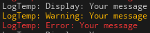 - UE_LOG(LogTemp, Display, TEXT("Your message"));
