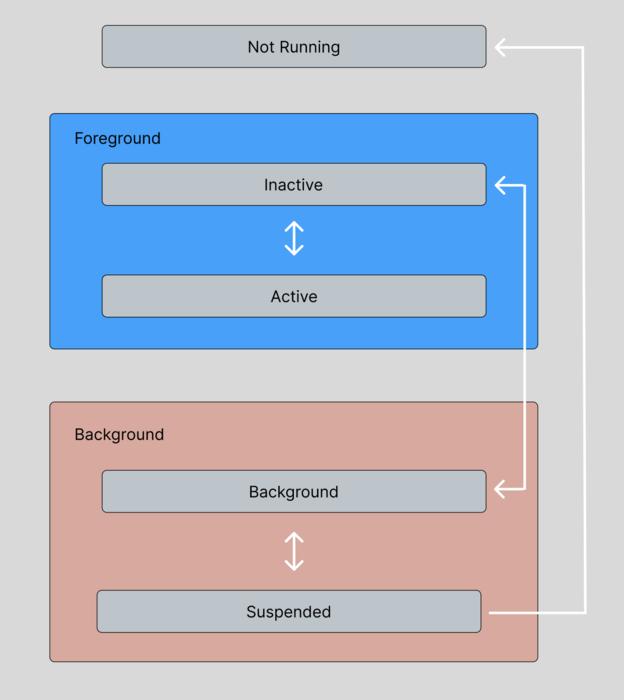아예 실행되지 않았거나 시스템에 의해 종료되었을 때의 상태실행되어 클라이언트에게 보여지고 있는 상태Foreground에 진입하지만, 어떠한 이벤트도 받지 않는 상태 앱의 상태 전환 과정에서 잠깐 머무는 단계 (예시 : 배터리 부족 알림이 뜰 경우, 외부 알림이 올 경우)실제 실행중이고 사용자 이벤트를 받아서 상호작용할 수 있는 상태 바로 Active상태는 될 수 없으며 Inactive 상태를 거쳐서 Active 상태가 됩니다. (예시 : 평상시 우리가 앱을 화면에 띄우고 사용할때)홈 화면으로 나가거나 다른 앱으로 전환되어 현재 앱이 클라이언트에게 보여지지 않는 상태화면을 나가거나 다른 앱으로 전환이 되었지만 실직적으로는 앱이 실행중인 상태 (예시 : 음악 앱을 키고 화면을 닫아도 음악이 나올때, 타이머를 작동시키고 화면을 내려도 작동할때)Background상태에 있지만 아무 코드도 실행하지 않으며, 메모리상으로 올라가있지만 배터리를 사용하지않습니다. OS에 의해 메모리 부족현상이 발생하면 앱이 메모리에서 해제 될 수 있다.ios 13 이전에는 AppDelegate만을 사용하여 앱의 생명주기와 UI의 생명주기에 관련된 로직들을 다뤘습니다.