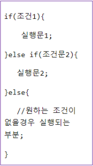 else if문은 여러개 코드 블록 중 특정 조건에 맞는 하나의 코드 블록만 선택해서 실행하고 싶을 때 사용한다.