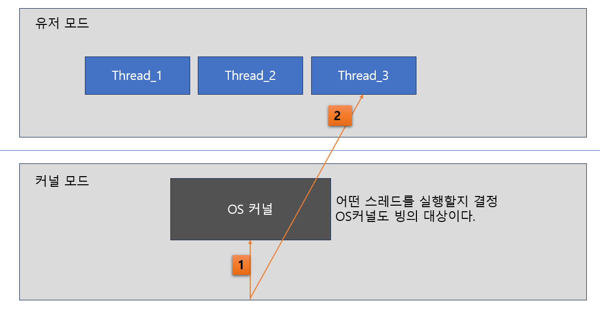 Thread_3을 실행하기 위해서는 OS커널을 한 번 거쳤다가 가야한다. 또한 레지스터를 변경해야하는데 실행하는 스레드를 변경하기 위해서는 레지스터도 복원해야한다. 실행중이던 Thread_1의 온갖 상태를 메모리에 저장하고 Thread_3의 온갖 정보를 레지스터에 올리는 작업이 필요하다.