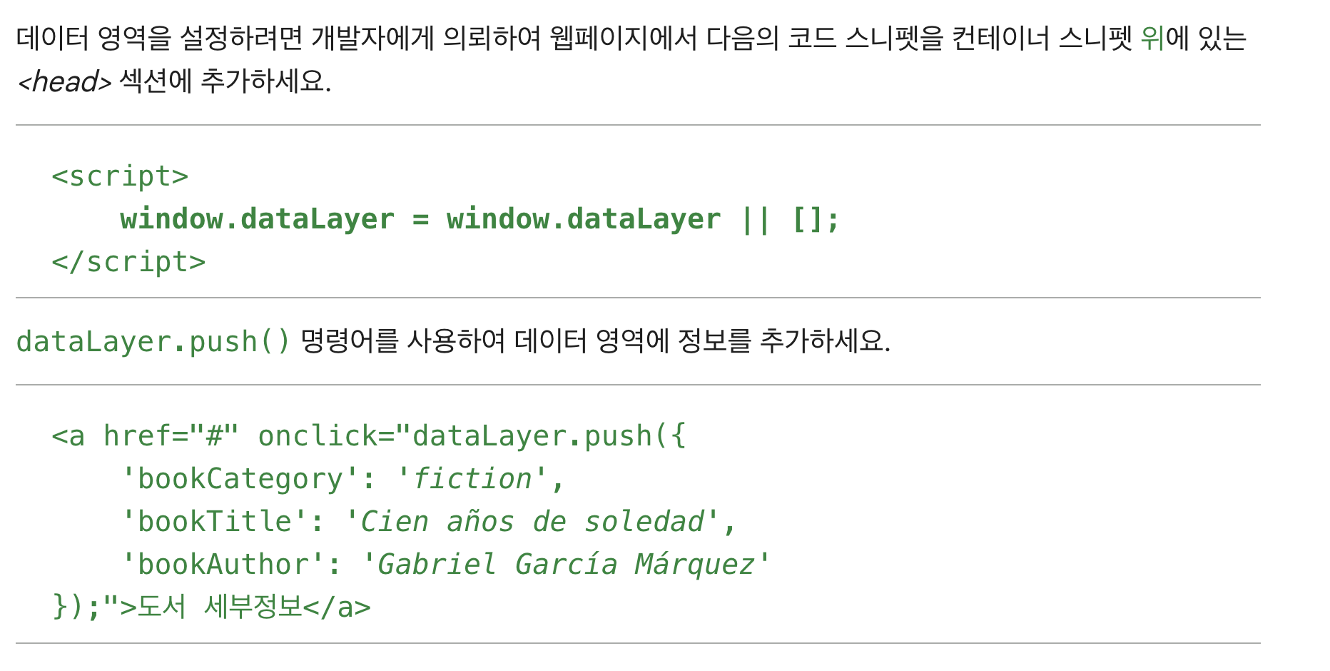 페이지가 로드될 때만 태그가 실행된다면 데이터영역을 설정하지 않아도 되지만 사용자와 상호작용할 때까지 원하는 데이터를 사용할 수 없을 경우 데이터를 데이터영역으로 푸쉬하는 코드를 추가해야 함. 그런 다음 원하는 이벤트 발생 시 데이터영역을 이용하도록 태그 관리자를 구성해야 함