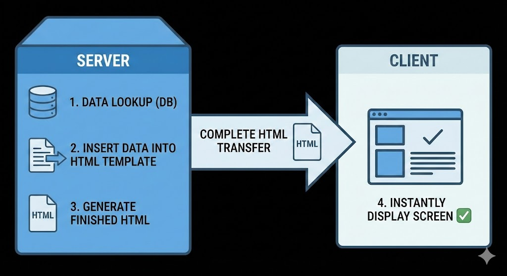 SSR은 서버에서 완성된 HTML을 만들어 클라이언트로 전송하는 방식입니다. 서버는 요청받은 페이지에 필요한 모든 데이터를 미리 조회하고, 이를 기반으로 완전한 HTML 문서를 생성합니다. 클라이언트는 이 HTML을 받아 곧바로 화면에 표시할 수 있습니다.