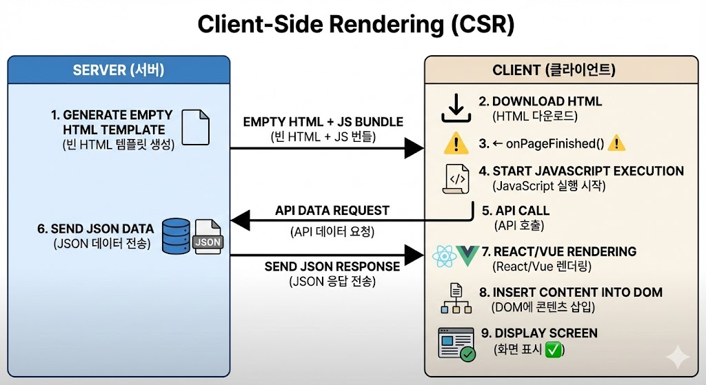 안드로이드의 onPageFinished가 호출되는 시점을 다시 떠올려보면, 문제가 명확해집니다. 사용자가 웹뷰 화면에 진입하면 HTML 문서 파싱이 끝나는 즉시 콜백이 실행되지만, CSR 환경에서 이 시점은 콘텐츠가 없는 빈 도화지 상태에 불과합니다. 정작 중요한 데이터를 불러오는 과정과 화면 렌더링은 onPageFinished가 호출된 이후, JavaScript가 본격적으로 실행되면서 비로소 시작되기 때문입니다.