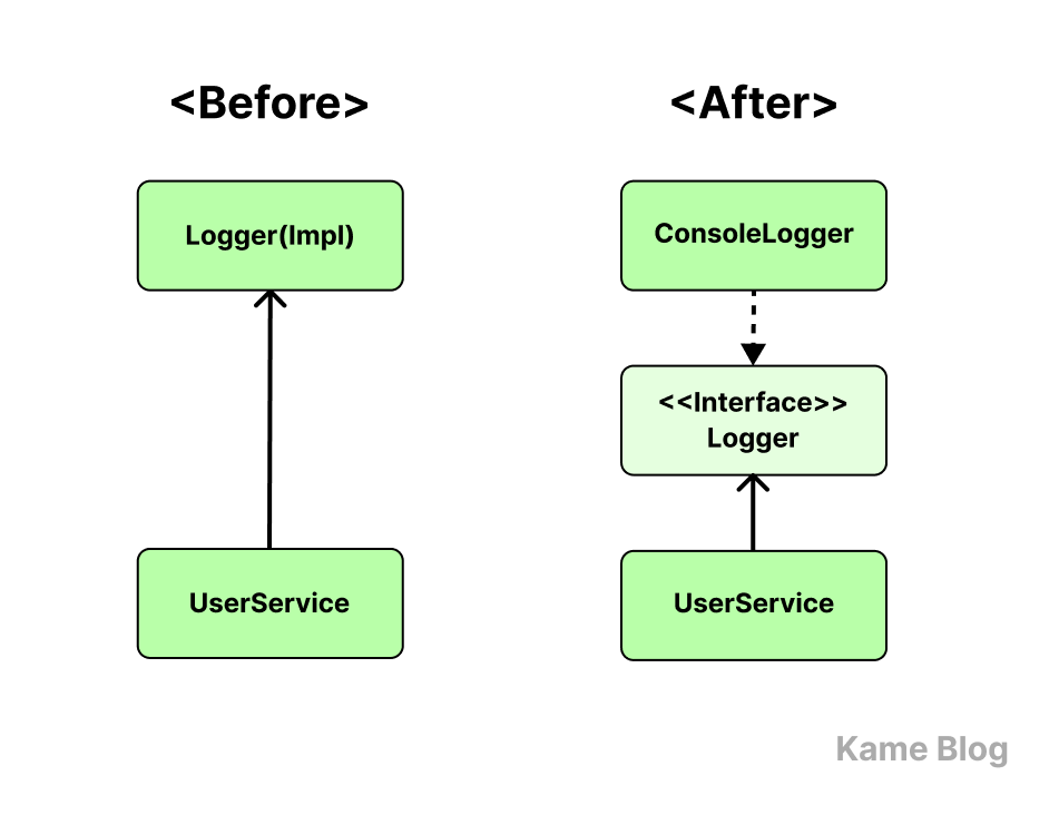 이 방식은 UserService가 Logger의 구체적인 구현에 대해 알 필요가 없게 만들어, 상위 모듈과 하위 모듈 간의 결합도를 낮춥니다.