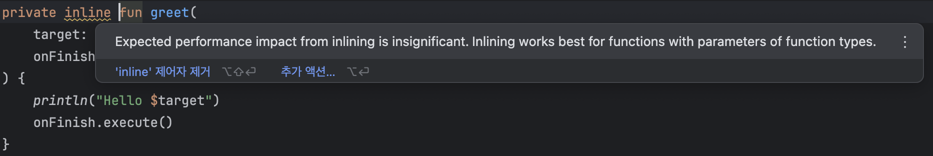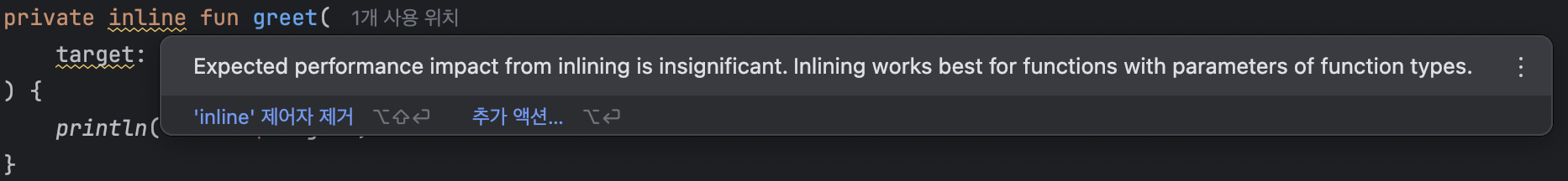 함수 호출은 인라인되었지만, 성능 향상은 미미합니다. IDE가 "Expected performance impact from inlining is insignificant"라고 경고하는 이유입니다.