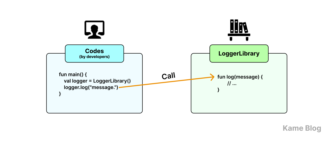 라이브러리의 log()를 언제, 어디서, 어떤 방식으로 호출할지를 전적으로 개발자가 결정하고 있습니다. 라이브러리 기능 호출 시, 개발자가 직접 자신이 작성한 코드의 실행 흐름을 관리하고 있던 것입니다. 이것이 바로 라이브러리를 사용할 때의 제어 흐름입니다.