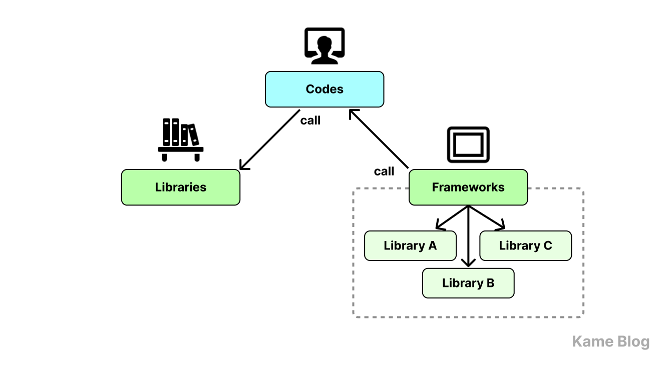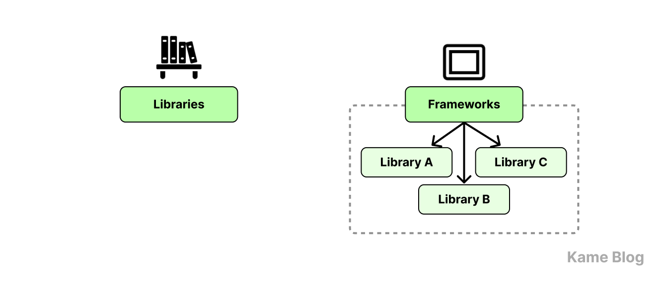 많이들 헷갈려하는 개념인 라이브러리와 프레임워크가 어떤 차이가 있는지 알아보도록 하겠습니다.