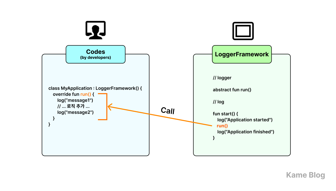 LoggerFramework 기준으로는 애플리케이션의 시작과 끝을 알리는 로그를 자동으로 출력하는 기능이 추가되어 있습니다. 개발자가 원하는 로직(run)을 작성하면, 프레임워크가 실행 흐름을 관리하면서 적절한 시점에 그 로직을 실행하고 필요한 부가 작업도 함께 처리해 줍니다.