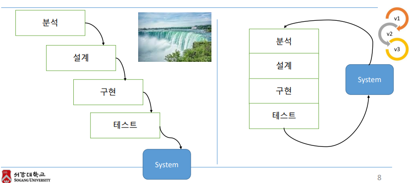 - 애자일 방법론 : 개발 초기부터 빈번한 통합을 통하여 문제점을 빨리 발견하고 수정하는 방식을 택한다.