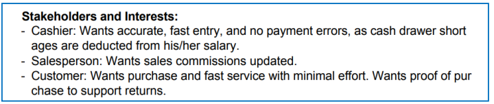 - Use Case가 어떤 이해관계자의 어떤 관심사를 충족시키기 위해 설계되었는지를 명확하게 기술