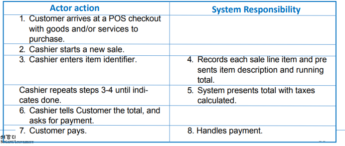 - 이 방식은 주로 대화형 형식으로 사용되며, 두 개의 열(column)을 사용하여 액터와 시스템 간의 대화를 나타냅니다.