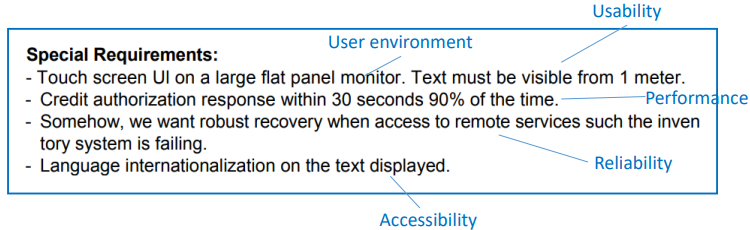 - Use Case에 대한 Non-functional requirements, quality requirements, design constraints 등을 기술