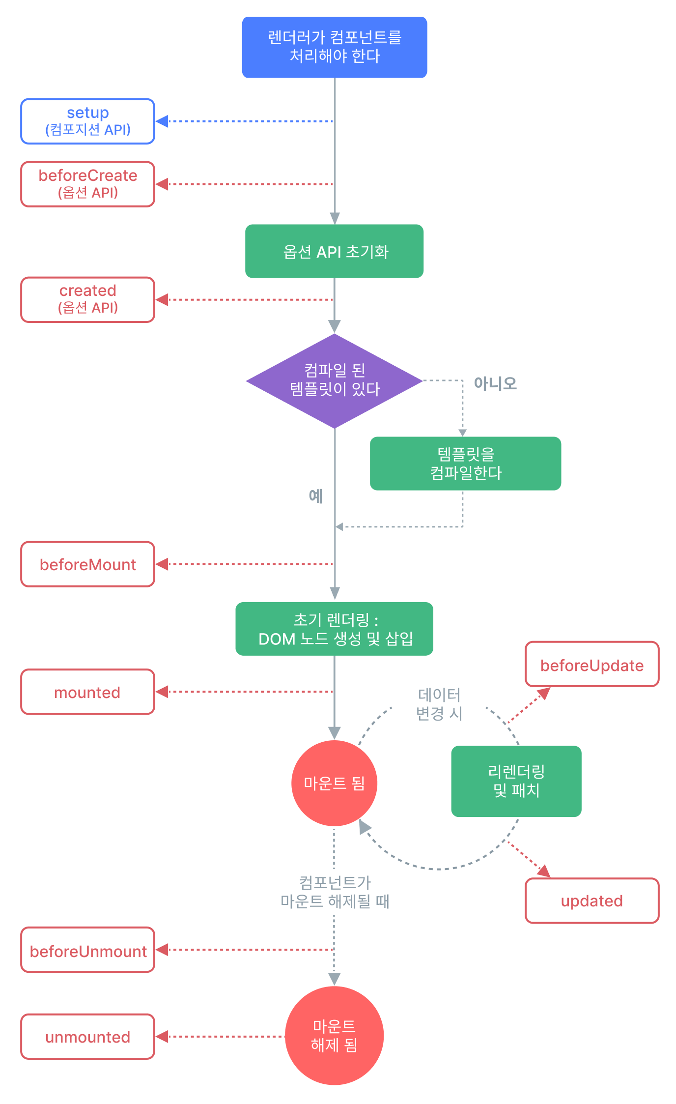 컴포넌트를 보여줄 때: create -> mount 이 단계로 생성된다.