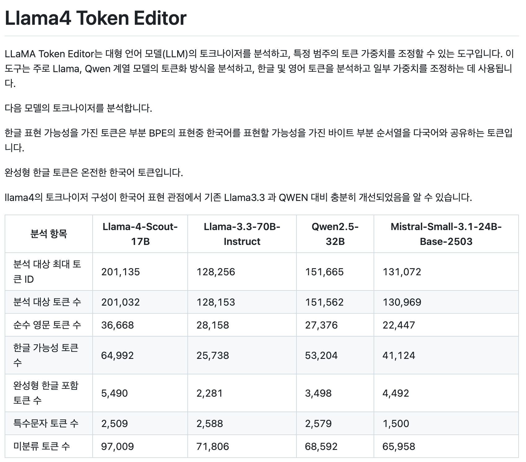 기존 llama 대비 5배 이상 llama3.3 대비 2.5배 이상 가장 한국어 지원비율이 높던 Qwen 대비도 높은 한국어 친화적 구성을 보인다고 한다.