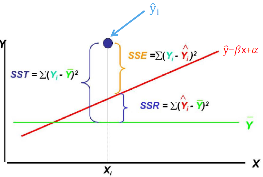 ∑ ( y i − y ˉ ) 2 = ∑ ( y i ^ − y ˉ ) 2 + ∑ ( y i − y i ^ ) 2 \sum (y_i - \bar{y})^2 = \sum (\hat{y_i} - \bar{y})^2 + \sum (y_i - \hat{y_i})^2 ∑ ( y i − y ˉ ) 2 = ∑ ( y i ^ − y ˉ ) 2 + ∑ ( y i − y i ^ ) 2
