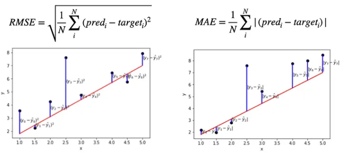 RMSE = 1 n ∑ i = 1 n ( y i − y i ^ ) 2 \text{RMSE} = \sqrt{ \frac{1}{n} \sum_{i=1}^{n} (y_i - \hat{y_i})^2 } RMSE = n 1 ∑ i = 1 n ( y i − y i ^ ) 2