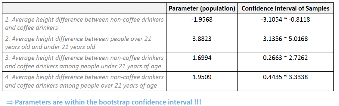 부트스트랩을 사용하여 평균 키 차이를 분석하거나, 특정 그룹(커피를 마시는 사람들과 마시지 않는 사람들) 사이의 평균 키 차이를 분석한다.