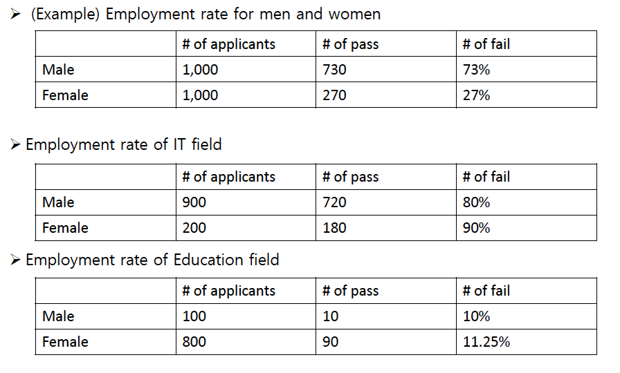 예시: 특정 직업군(예: IT와 교육 분야)에서 성별에 따른 취업률을 분석할 때, 각각의 직업군에서 보이는 성별 취업률 차이가 전체를 합쳤을 때와는 다르게 나타날 수 있다.