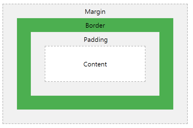 패딩(padding), 테두리(border), 마진(margin), 내용(content)로 구성된다.
