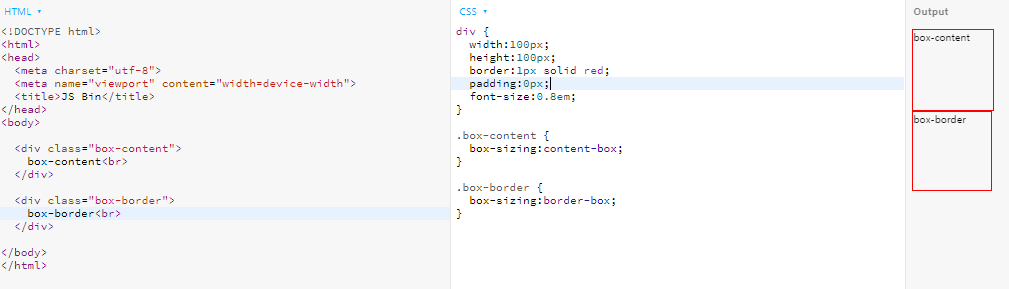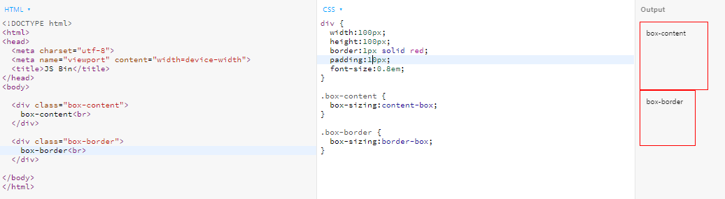 다음과 같이 box-sizing 속성을 각각 content-box와 border-box로 해 주었다. 그리고나서 padding을 늘려주면 아래와 같은 결과를 얻는다.