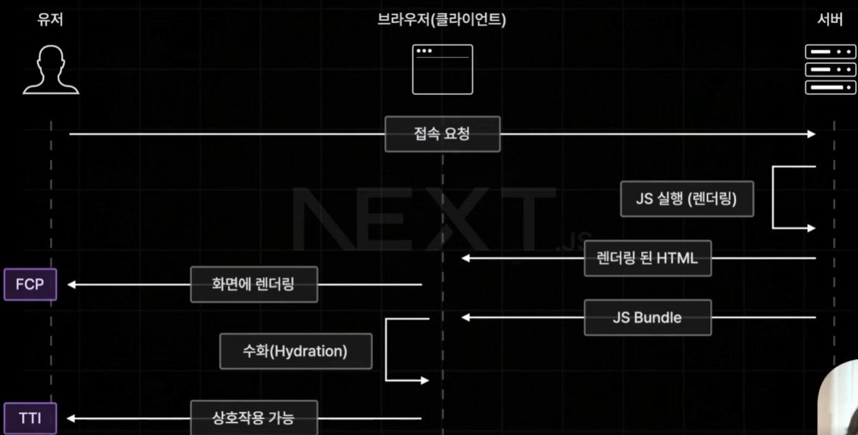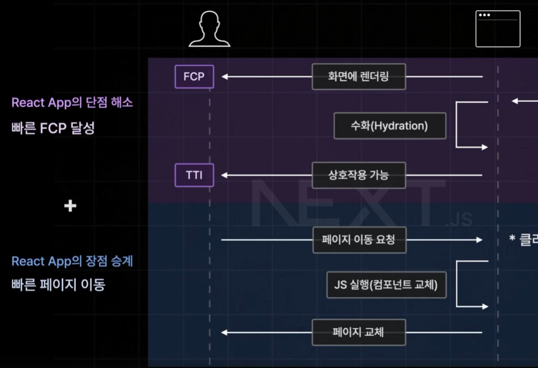 리액트는 초기 접속 요청 시에 브라우저가 HTML 렌더링과 리액트앱까지 직접 실행해야 되기 때문에 최초로 컨텐츠가 화면에 렌더링되는 시점인 FCP가 늦어진다는 단점을 가지게 된 것입니다.