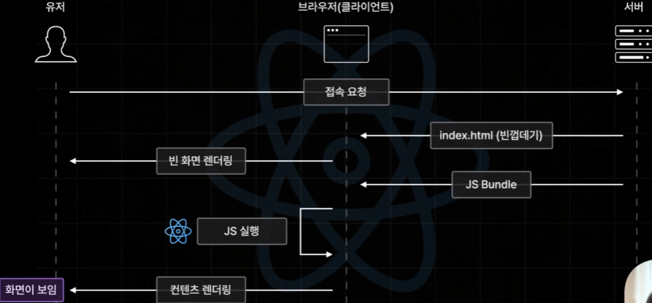 브라우저가 화면의 컨텐츠를 렌더링하기까지 빈 껍데기의 HTML도 받아와야 되고 리액트 앱도 받아서 최종적으로 리액트 앱을 실행까지 시켜야 하기 때문에 오래 걸립니다.