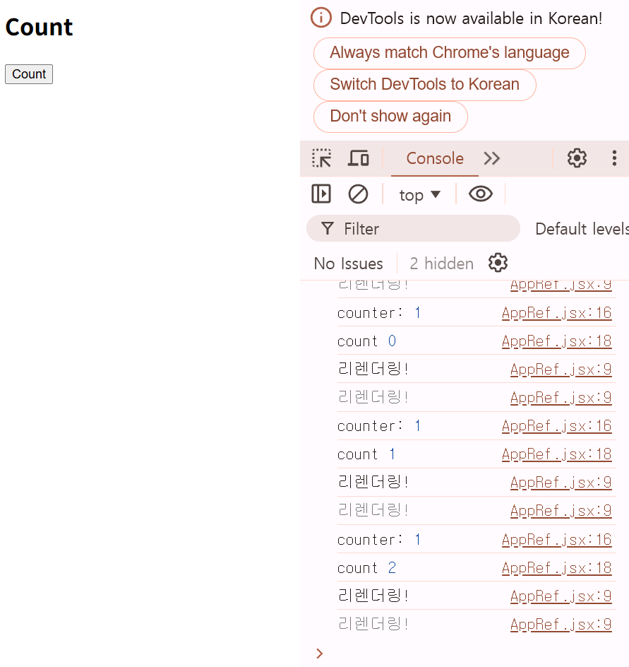 console.log(countRef.current); // 값이 업데이트되지만 리렌더링은 발생하지 않음