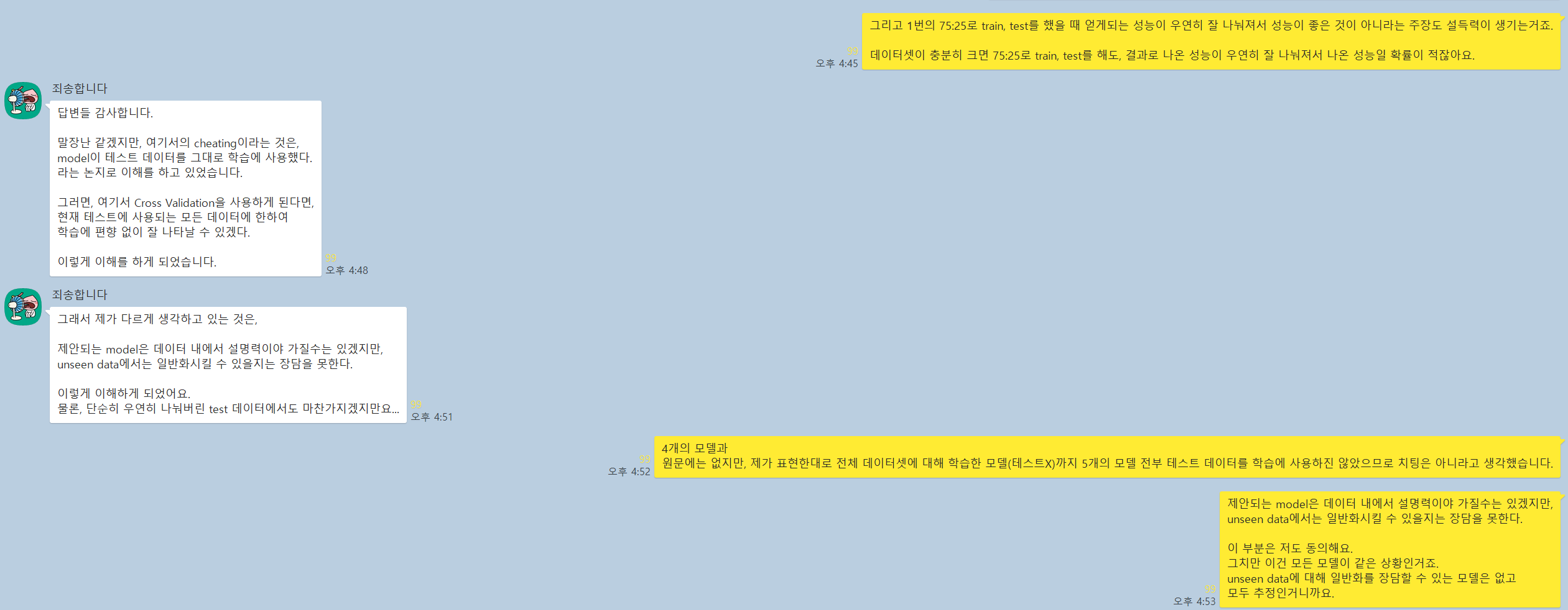 모델 4개는 각각 독립적으로 학습되었고(이 부분은 동의하시는 것 같고), 그건 마치 4일차의 모든 샘플들을 고정된 테스트 셋으로 평과한 것과 같은 효과가 있다.