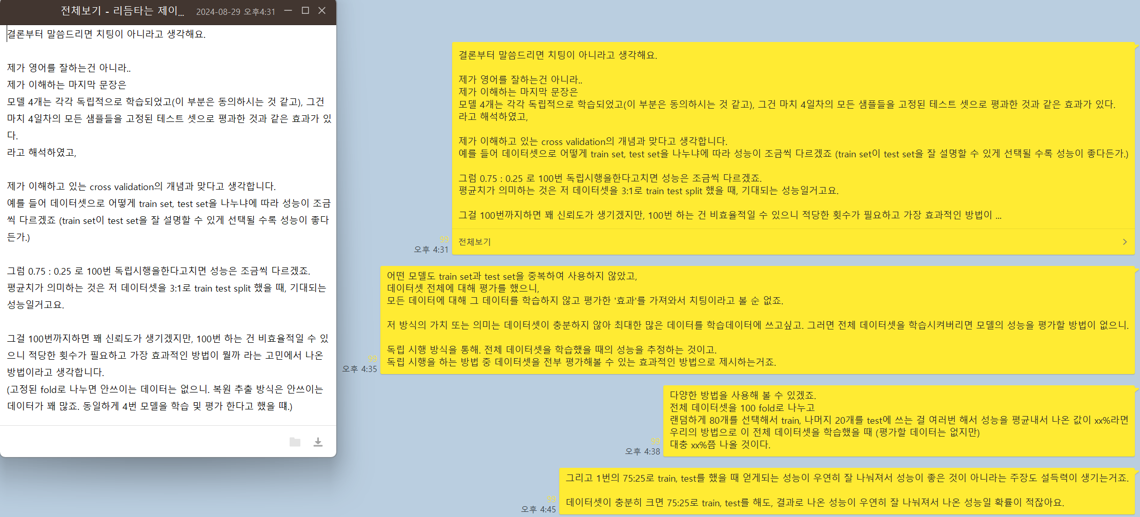 그리고 1번의 75:25로 train, test를 했을 때 얻게되는 성능이 우연히 잘 나눠져서 성능이 좋은 것이 아니라는 주장도 설득력이 생기는거죠.