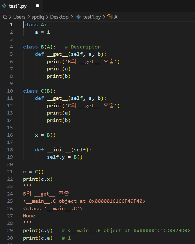 이때, B의 get의 2번째, 3번째 parameter로 a, b는 각각 (instance, owner라는 이름으로 많이들 정의하는 듯 하다.) c와 C를 argument로 받게 된다.