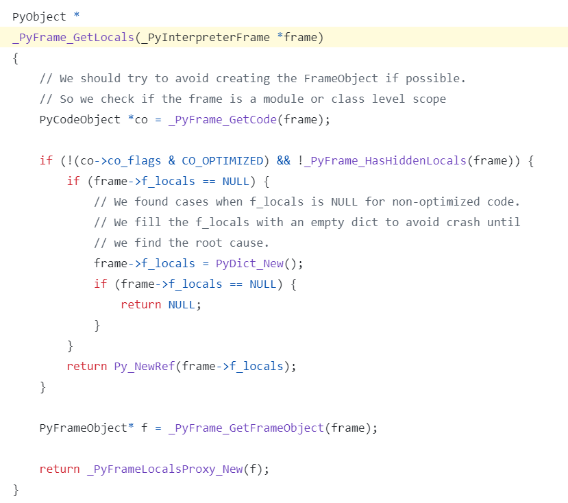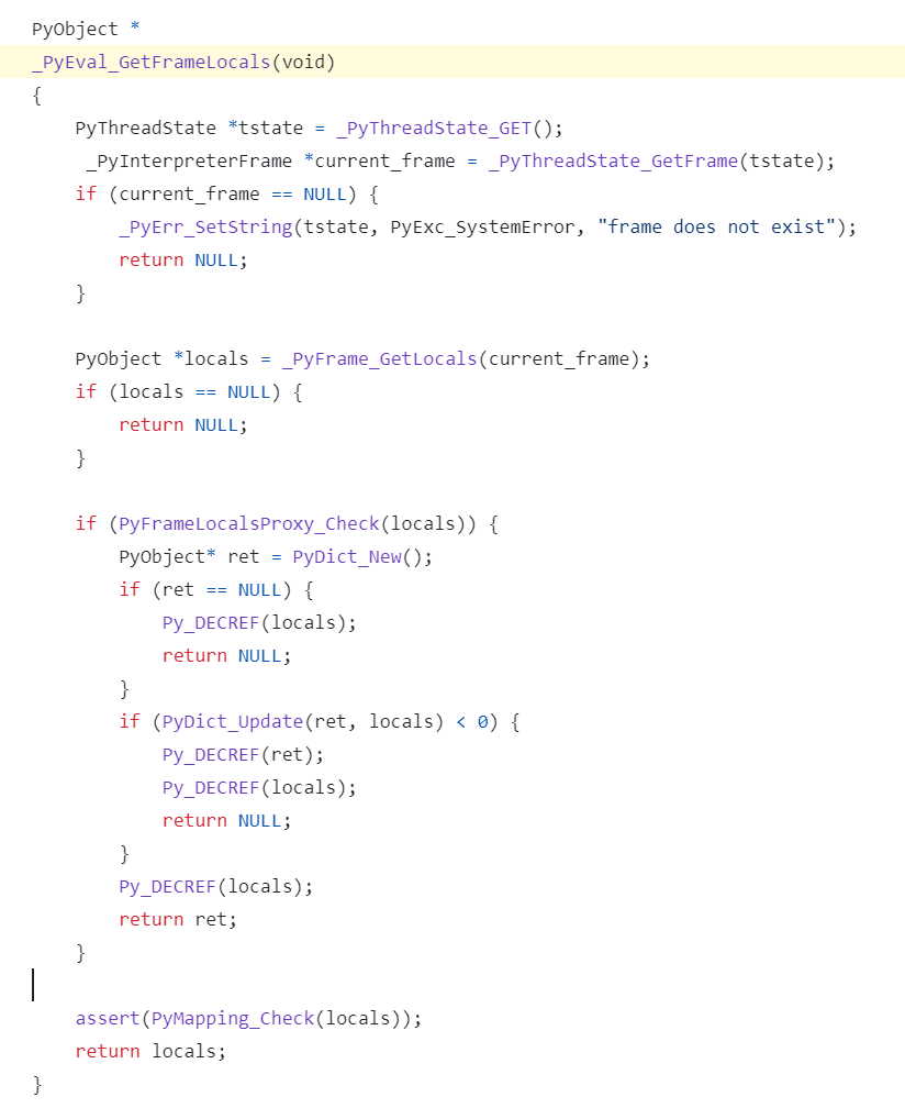 여기서 local 프록시임을 확인해서 프록시라면(지역 스코프에서 실행), 새로운 dict ret를 만들어서 그 곳에 locals의 내용을 복사해서 ret을 return하는 것 같다.