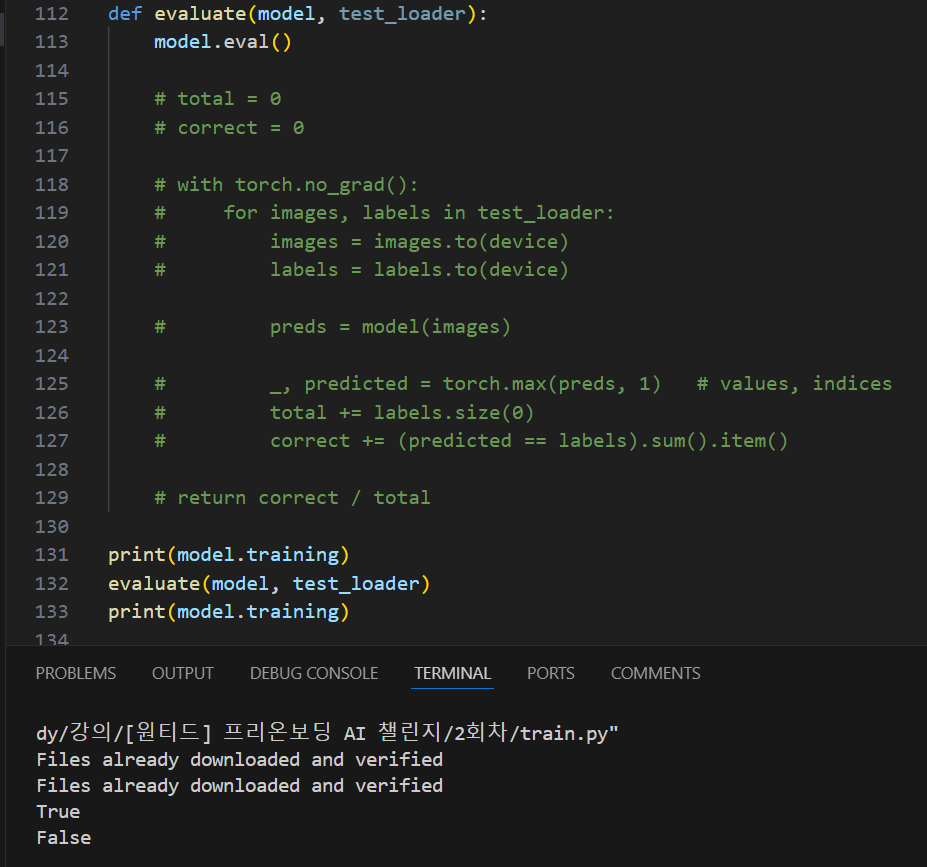 추가적으로 model을 인자로 받고 eval() 메소드를 실행해도 원래 model의 training 속성값이 False로 바뀌는 것을 확인할 수 있다.