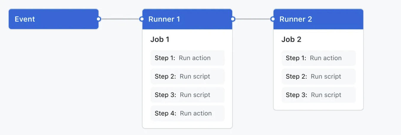 그리고 job 에 있는 각 step 은 같은 runner 에서 실행되고, step과 step 끼리는 데이터를 공유할 수 있다. 다른 job 들간의 의존성을 설정할 수 있다!. 가령 Job1 이 실행되고 나서 Job2 가 실행된다거나 등등을 설정할 수 있다. 기본적으로는 각 job은 어떤 의존성을 가지고 있지 않고 병렬적으로 실행한다.