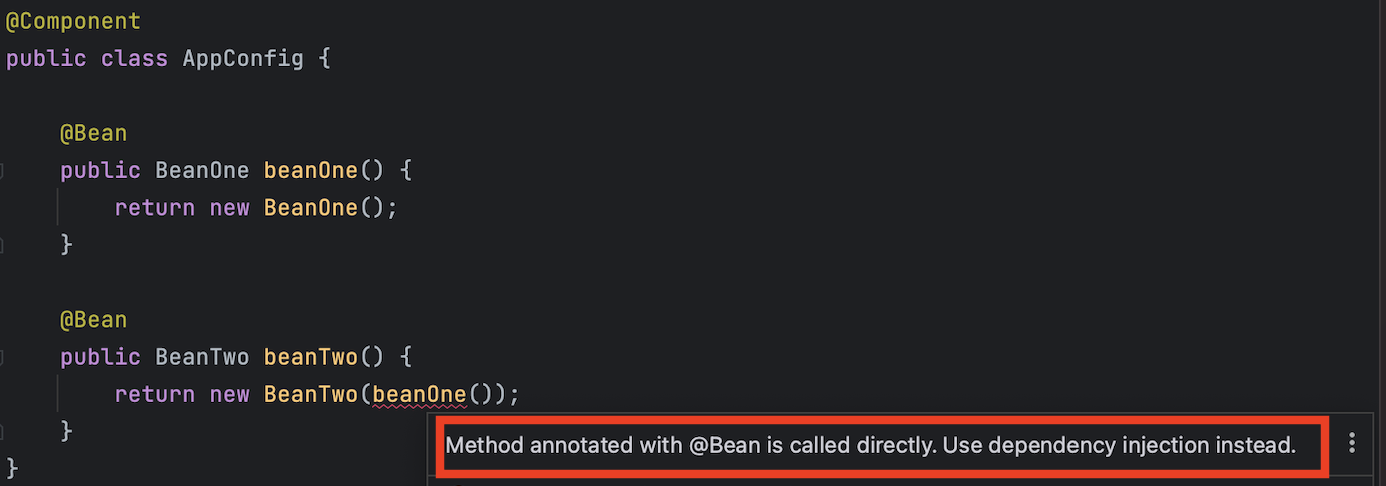 @Configuration 클래스는 동일한 클래스 내의 다른 @Bean 메소드를 호출함으로써 빈 간의 의존성을 정의할 수 있도록 한다.