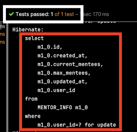 통과하였습니다. 실제 로그를 보면 select .. for update 쿼리가 나간 것을 알 수 있습니다. for update 절은 쓰기 잠금(배타 잠금, Exclusive lock) 을 설정합니다. 그렇기 때문에 다른 트랜잭션에서는 해당 레코드를 변경하려고 하는 쿼리는 실행할 수 없습니다.