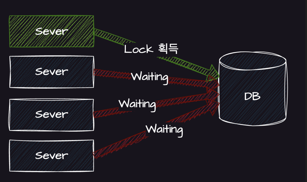 동시에 여러대의 서버에서 요청이 들어온다고 가정 했을 때, 먼저 락을 획득한 서버에 대해서만 쓰기를 허용할 수 있도록 합니다. 그리고 나머지 서버들은 락을 획득할 때 까지 대기하다가 락을 획득 하면 비로소 데이터에 대한 접근을 하게 됩니다. 이를 통해 데이터의 정합성을 보장할 수 있게 되었습니다.